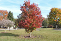 Now here's a few pretty fall trees to share. The red maple is in our yard, the more 'umbrella shaped' one is in our neighbor's yard.