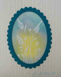 Hey and Happy Sunday afternoon. Here's a card for today, using that very versatile Penny Black Aspire stamp. Card base is cream cardstock, embossed with Paper Studio A2 Doodle Border. Since I used lightweight C/S, I embossed 2 pieces at once, so that the embossing is not done so deeply that it nearly cuts the paper. Saved the 2nd piece (a snippet!) for this card. I had boo-boo'd when embossing the oval image (also a snippet) when I was experimenting with the new Tim Holtz colors, and got an edge where I didn't want it to be.(I heat embossed with white over a versamark stamping, then sponged with the new colors). Decided to cut a smaller oval shape in the cream cardstock - surprisingly it didn't flatten out the previous Doodle Border emboss too much. Adhered the stamped image to the back of the oval window on the embossed card stock. Used a Spellbinder scalloped oval in a size that fit where I needed - with - yes, another snippet left on the desk where I saw it! Cut this oval as a teal frame, adhered to the window...it hides the boo-boo. So one card ready for a sentiment and quick insert when I need it. (Makes me feel organized when I can get a card made ahead, and not scurry at the last minute to get one ready! :-)