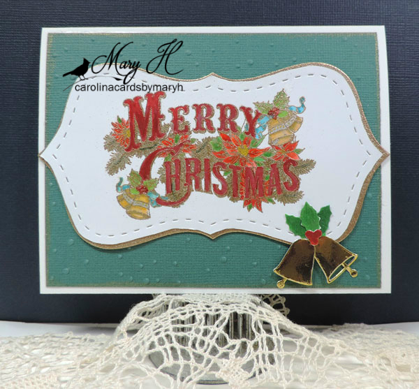 - die cut with a sizzix die, mat cut with the larger die in the set. Edged the mat with versamark, then added some Queen's Gold.