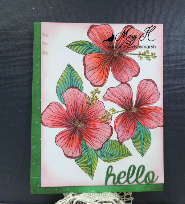 This is a really pretty Hibiscus image Mary and love the colours you have used and the pretty inked edges which go beautifully with that green background you made and embossed. Hope you are feeling better and that DH has finished all his tests now. x