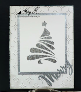 Hand trimmed the tree piece..the silver mat is a textured lightweight silver DP. Embossed this mat with a PTI die. Jennifer McGuire has an excellent video showing how to emboss using dies.