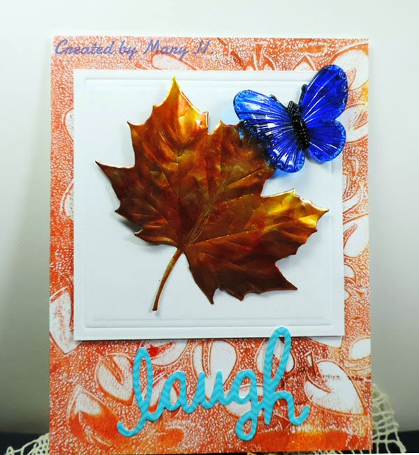 - Background was made using the gelli; the leaf was made with alcohol inks and the silver side of a soda can which was die cut with a maple leaf. The leaf has been floating around on my desk for a bit, and when I was adhering it to the white background, realized a tiny tip had broken off. Hence the blue butterfly - which was a Dollar Store find. (A bunch of blue & pink plastic party favor type of thing). A dark blue copic changed the intensity of the blue, and dark gray colored the insect's body. The sentiment is a sticker & think this shall be a birthday card after I add the appropriate inside verse.
